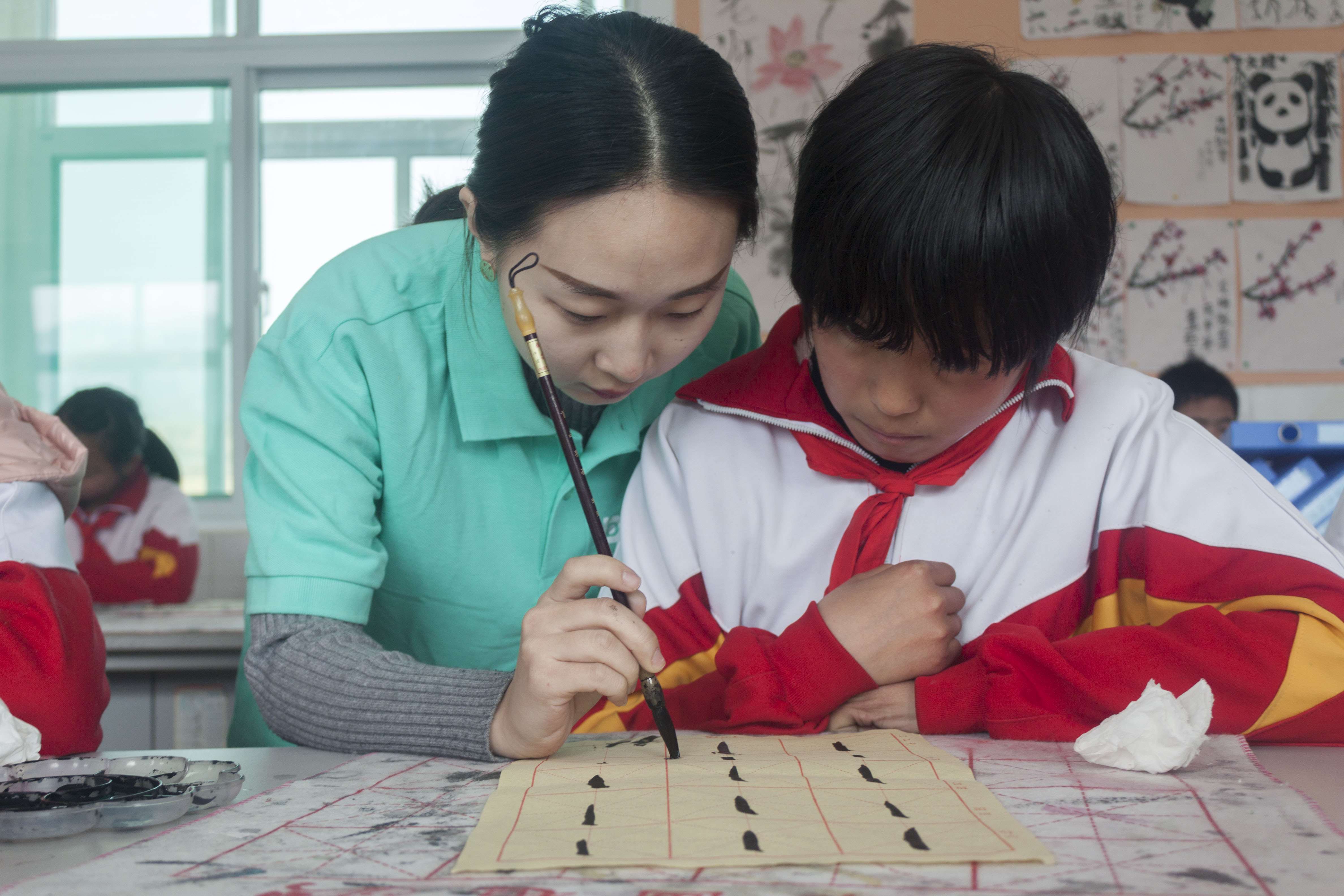 授牌仪式结束后,大家参观了纸坊小学各年级的艺术支教课堂,并与支教的学生和孩子们进行了交流,欣赏了孩子们一年来的艺术创作作品。